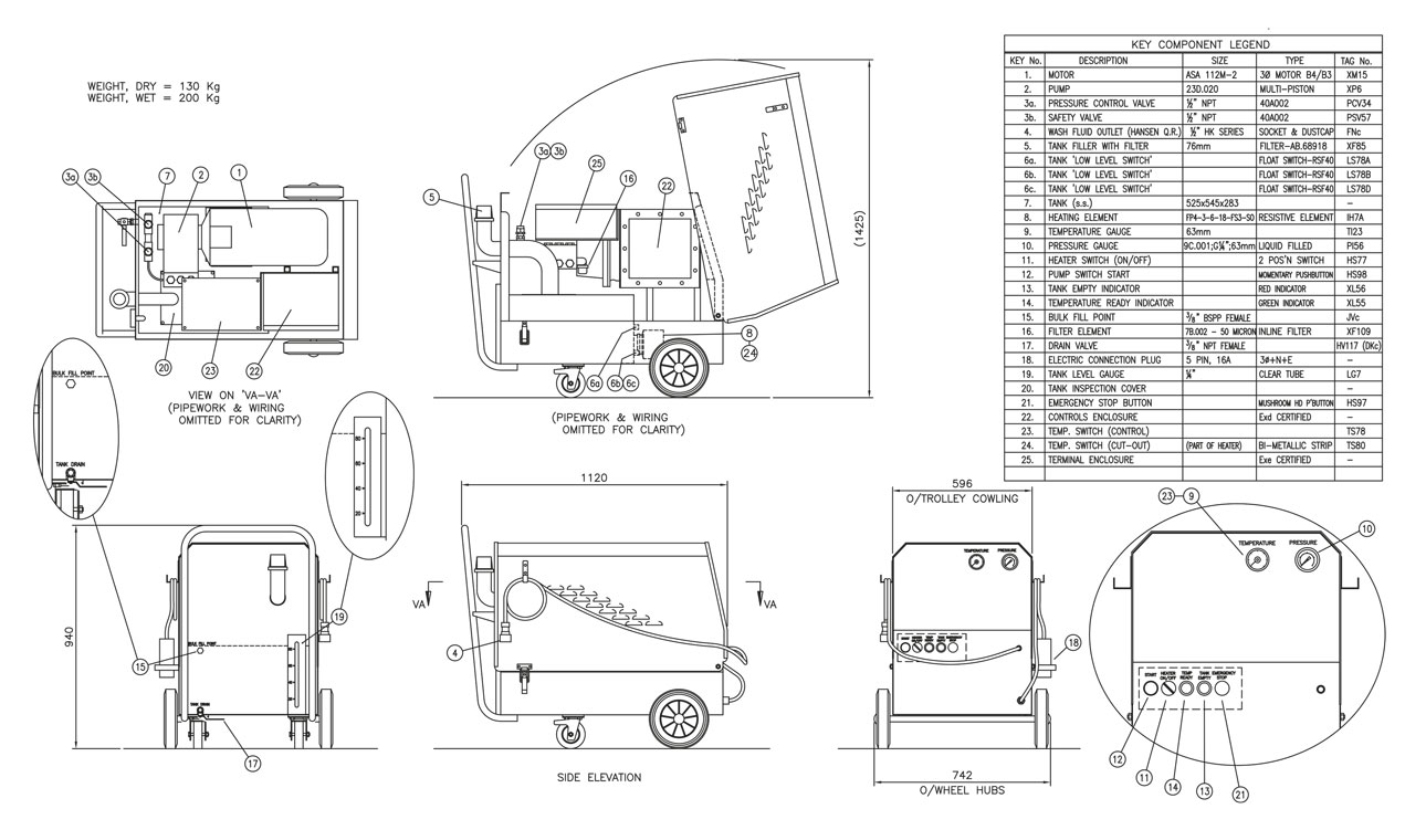 The gas turbine water wash system is designed to clean gas turbine compressor blades by using a high-pressure hot water jet, with a maximum pressure of 150 bar. The unit is free standing and has a three phase 50 Hz or 60 Hz, 480 VAC, 4 kW motor driving a high-pressure water pump. There is also a tank for demin water within the unit with an integrated 6 kW temperature controlled heating element.
