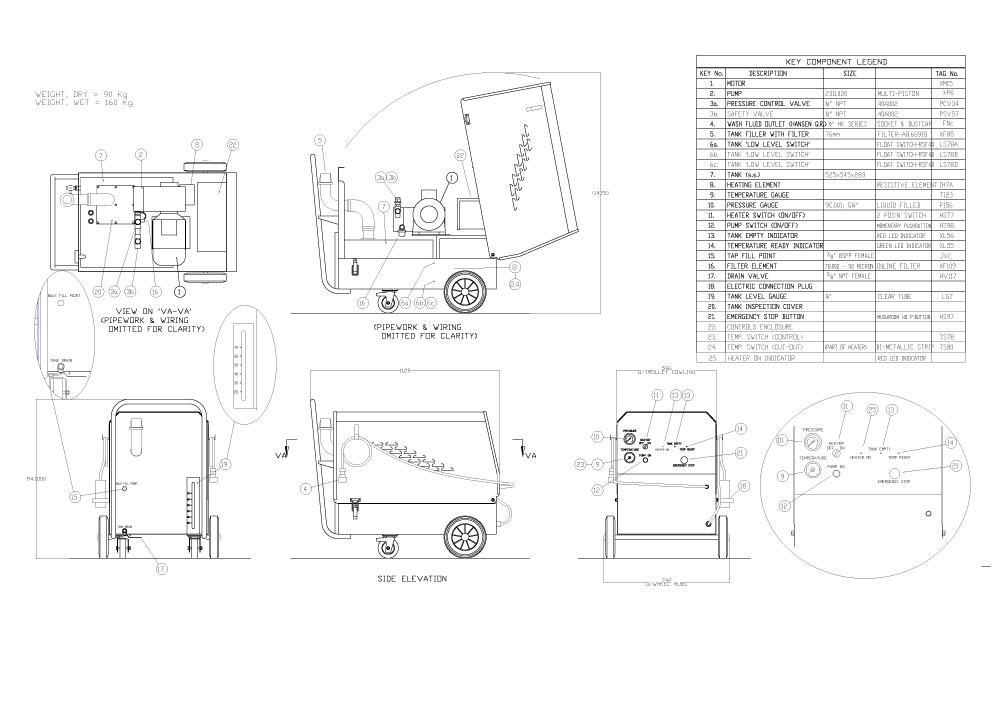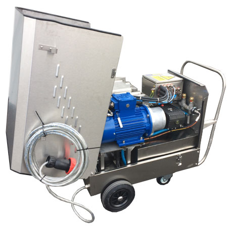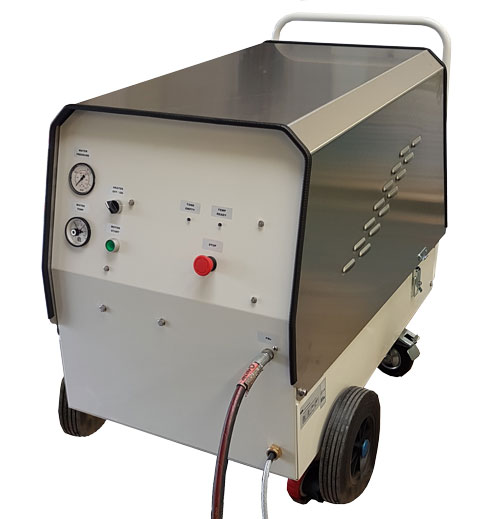 The gas turbine compressor wash system is designed to clean gas turbine compressor blades by using a high-pressure hot water jet, with a maximum pressure of 150 bar. The unit is free standing and has a three phase 50 Hz or 60 Hz, high-pressure water pump. There is a water tank within the unit with an integrated 6 kW temperature controlled heating element.